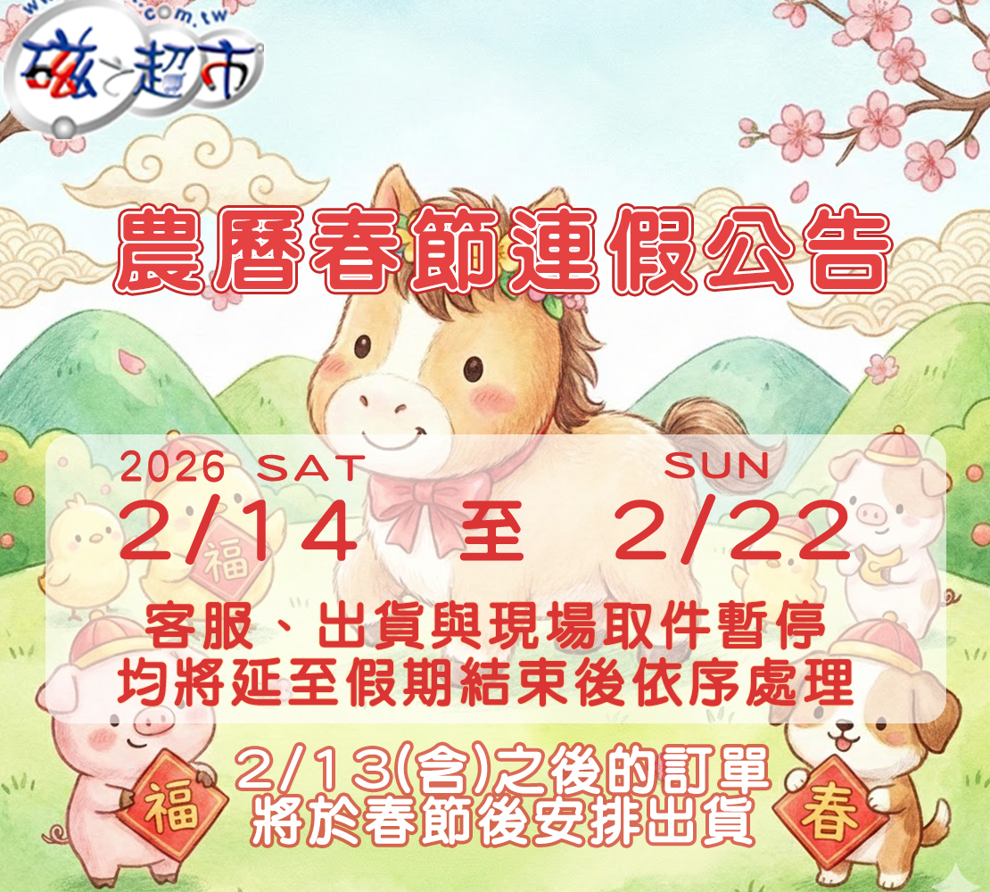 磁之超市將於農曆新年連假公休,但網站24小時不休息,歡迎選購磁鐵及磁性保健用品,上班日即會幫您寄出